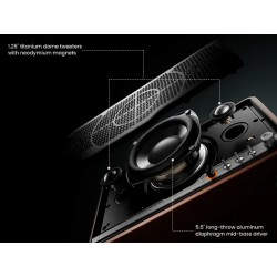 La caja del altavoz, hecha a mano en madera, alberga dos tweeters de cúpula de seda de 1,25" con imanes de neodimio y un altavoz de medios-graves de 4" de largo alcance. Optimizados por los canales Bass Reflex patentados MazeTube y la tecnología de supresión de ruido de aire TurbMuff, los tubos bass reflex duales simétricos ofrecen graves profundos y potentes, a la vez que minimizan el ruido del puerto y la resonancia acústica. Esta configuración garantiza una potencia de salida RMS total de 60 W, que produce agudos nítidos, medios claros y graves potentes.