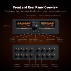 Su característica más distintiva es la incorporación de grandes medidores VU analógicos duales, que se iluminan y se mueven al ritmo de la música, añadiendo un toque estético clásico y visual a tu sistema Hi-Fi. El dispositivo está construido con una robusta carcasa de aleación de aluminio y utiliza componentes internos de alta calidad, como relés de conmutación y resistencias de carga de protección, para asegurar una transmisión de señal de casi nula pérdida.