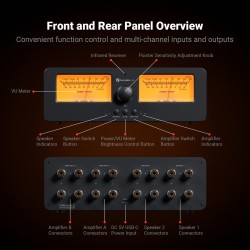 Su característica más distintiva es la incorporación de grandes medidores VU analógicos duales, que se iluminan y se mueven al ritmo de la música, añadiendo un toque estético clásico y visual a tu sistema Hi-Fi. El dispositivo está construido con una robusta carcasa de aleación de aluminio y utiliza componentes internos de alta calidad, como relés de conmutación y resistencias de carga de protección, para asegurar una transmisión de señal de casi nula pérdida.