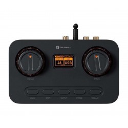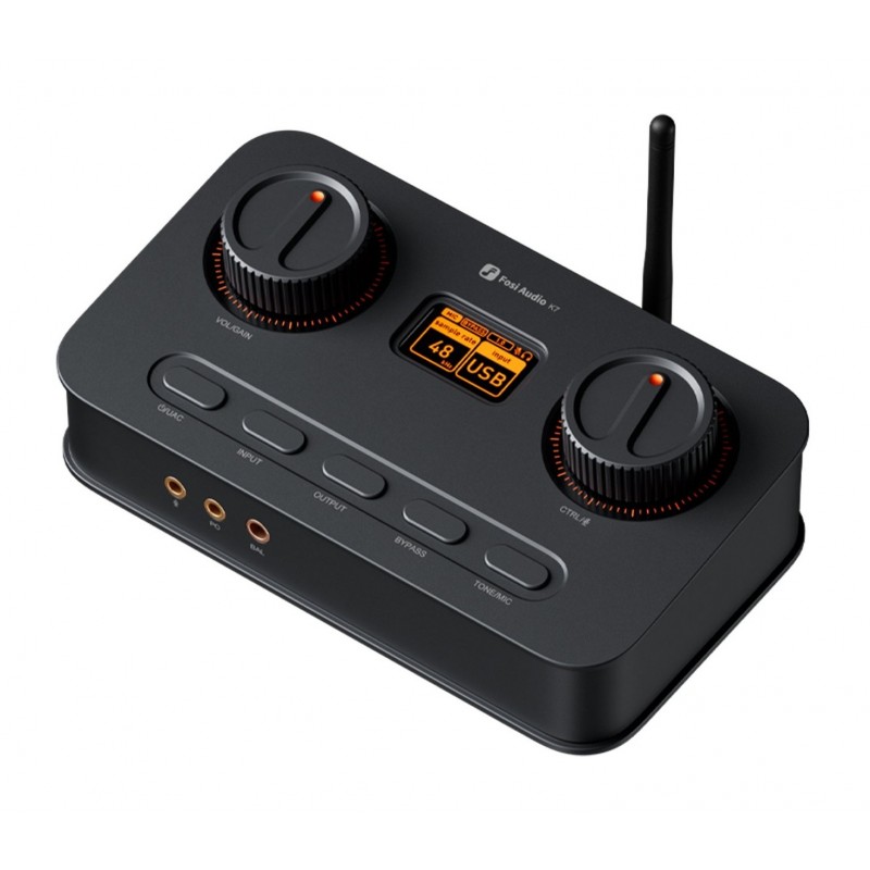 El Fosi Audio K7 es un dispositivo "todo en uno" que combina un DAC de alta resolución con un potente amplificador de auriculares. Su diseño compacto, en ángulo ergonómico y con chasis de aleación de aluminio, lo hace ideal para el escritorio.