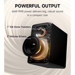 Cada gabinete de madera, hecho a mano, alberga un tweeter de cúpula de seda de 1" y un altavoz de medios-graves de aluminio de 3" de largo alcance. Alimentados por un amplificador de audio de clase D de bucle cerrado de alta eficiencia de Texas Instruments, los altavoces producen un total de 66 W RMS, ofreciendo un sonido potente y nítido.