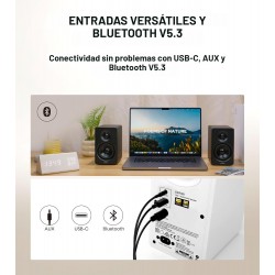 >>Sensibilidad de entrada: AUX - 500 ± 50 mV, USB-C - 450 ± 50 mFFS, Bluetooth - 450 ± 50 mFFS
