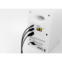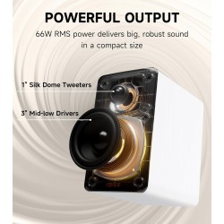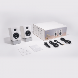 Cada gabinete de madera, hecho a mano, alberga un tweeter de cúpula de seda de 1" y un altavoz de medios-graves de aluminio de 3" de largo alcance. Alimentados por un amplificador de audio de clase D de bucle cerrado de alta eficiencia de Texas Instruments, los altavoces producen un total de 66 W RMS, ofreciendo un sonido potente y nítido.