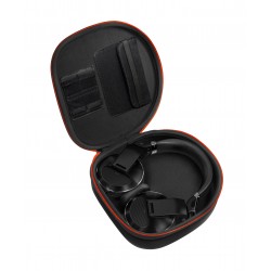 Un estuche plano diseñado para caber fácilmente en una bolsa de viaje, protege tus auriculares de cualquier daño en la carretera y proporciona espacio para almacenar dispositivos USB y tarjetas SD.