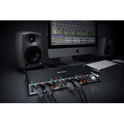 Los preamplificadores de micrófono estelares de Rubix44 son de bajo ruido y alta definición, con mucho margen para capturar todo el impacto y los detalles de lo que sea que esté grabando. Los conectores combinados flexibles y las entradas Hi-Z le permiten conectar una variedad de fuentes, incluidos micrófonos y guitarras, sin necesidad de adaptadores ni cables especiales. Cuatro salidas individuales permiten posibilidades sofisticadas de enrutamiento y monitoreo, como enviar un clic a un intérprete, configurar un monitor de escenario o enrutar el audio a un equipo externo.