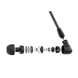 Los controladores dinámicos únicos de 7 mm de banda extra ancha (XWB) de fabricación alemana del IE 300 ofrecen una asombrosa respuesta de frecuencia de 6 Hz a 20 kHz con una distorsión armónica total inferior al 0,08%. Una cámara de resonador elimina las resonancias de enmascaramiento, mientras que las láminas de membrana recientemente desarrolladas minimizan las resonancias naturales. Esto significa que ya sea que esté monitoreando a niveles de presión de sonido bajos o altos (hasta 124 dB SPL), su audio permanece libre de distorsiones con frecuencias altas claras, medios bien definidos y una respuesta de bajos cálida.