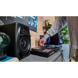 Los altavoces DM-50D ofrecen un sonido de graves equilibrado y contundente y pueden producir potencia adicional cuando la necesitas, ya que integran un nuevo amplificador Clase D y un woofer de 5 pulgadas en cada unidad. Presiona el interruptor para cambiar del modo DJ al modo Producción y la configuración del DSP se ajustará automáticamente para crear el mejor sonido para cada opción.