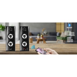 El Genius SP-HF2800BT es compatible con dispositivos Bluetooth como teléfonos móviles, iPhone, iPod, iPad, tabletas, computadoras y más. Parlante bluetooth con potencia extraordinaria de 60W y sonido extraordinario con 3 modos de reproducción, llena tu espacio con audio de alta calidad que suena increíble, disfruta de auténtico sonido envolvente y escuchar las canciones como nunca antes las has escuchado, adapta para cualquier estilo de vida. El conector de audio de 3,5 mm para diversos dispositivos como tabletas, teléfonos inteligentes, computadoras portátiles, PC, MP3 etc., para cualquier momento y en cualquier lugar que desee.