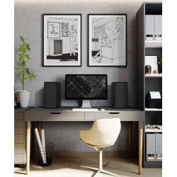Coloque las rejillas magnéticas de bajo perfil para obtener una elegante apariencia negra que combina con la decoración de casi cualquier habitación, o déjelas fuera para admirar la ingeniería del woofer de cobre y el tweeter de bocina Tractrix.