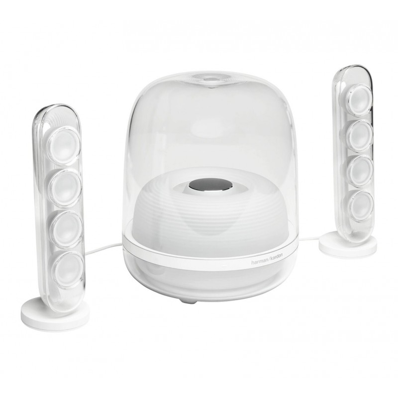 Llene la habitación con un audio rico utilizando el sistema de altavoces inalámbricos 2.1 Bluetooth SoundSticks 4 de Harman Kardon . Con un icónico diseño de cúpula transparente, el sistema de altavoces inalámbrico Bluetooth se integra en casi cualquier habitación o entorno. Los parlantes de rango completo producen hasta 140 W de potencia y tienen un subwoofer de 5,25" con activación hacia abajo para sonido de alta fidelidad para música, películas y más.